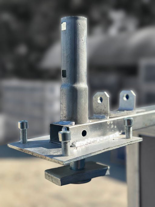 Proceed to hoist each assembled arch truss one at a time into position. This step will require lifting and safety equipment to perform the task to WHS standards. Positioning each arch onto the previously installed base plates on top of the shipping containers, and secure them down with the supplied nuts and bolts.