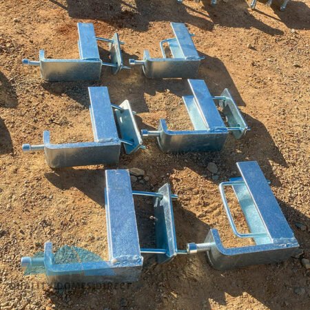 Proceed to hoist each assembled arch truss one at a time into position. This step will require lifting and safety equipment to perform the task to WHS standards. Positioning each arch onto the previously installed base plates on top of the shipping containers, and secure them down with the supplied nuts and bolts.