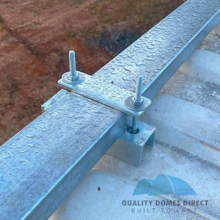 This GREY colour container shelter easily connects to 40ft shipping containers using the no-weld Quicklock system firmly secures the roof truss base plates and rails into position on top of the container. A base plate rail is clamped to top edge of the container, and additional trusses firmly attached and bolted on. The whole assembly process makes building the shelter super-easy because no special tools are required.