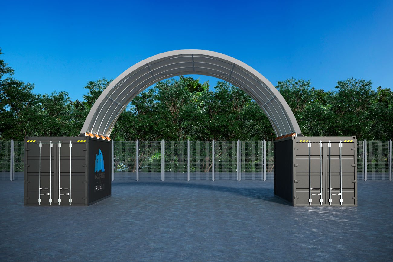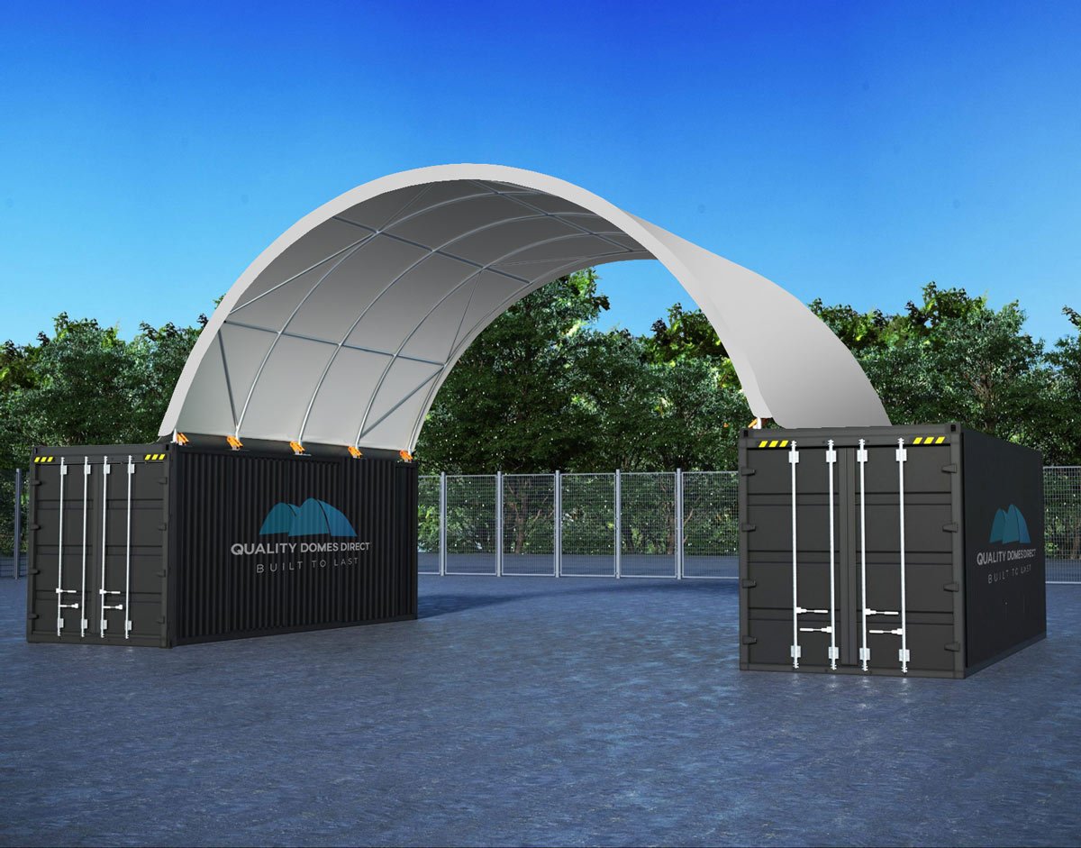 This Grey container shelter connects to 20ft shipping containers and features a 26ft (8 metre) opening at the front and back. Its Quicklock ‘no weld’ design makes it fast to assemble using a few metric ratchet spanners and long sockets.