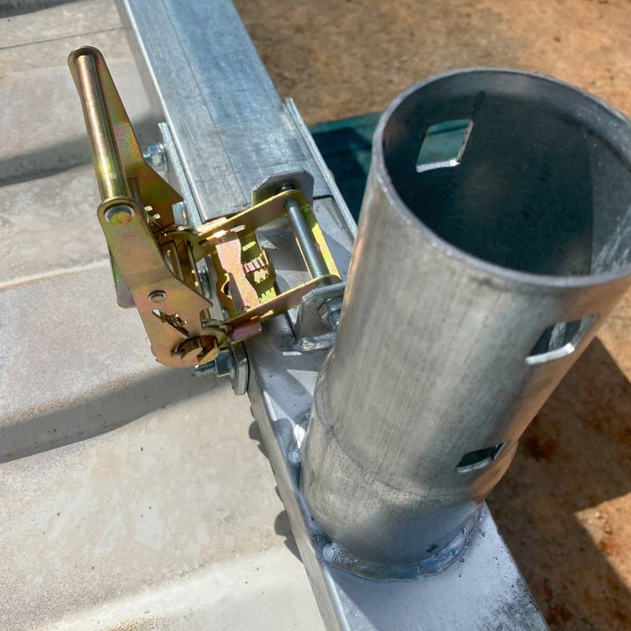 Proceed to lift each assembled arch one at a time. This step will require lifting equipment depending on the size and weight of the arches. Positioning each arch onto the previously installed base plates on top of the shipping containers, and secure them down.