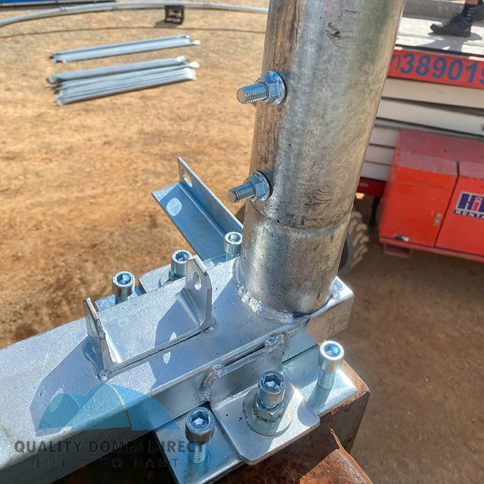 Proceed to lift each assembled arch one at a time. This step will require lifting equipment depending on the size and weight of the arches. Positioning each arch onto the previously installed base plates on top of the shipping containers, and secure them down.