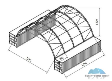 This 40x40ft (12x12m) Double Truss Bolted Quicklock Industrial Grade Dome Shelter is built to withstand the heavy-duty demands of large-scale projects, where semi-permanent, robust shelters are required.  This Quality Domes Direct container shelter is renowned for its ease of installation, portability and exceptional durability, making the steel frame, PVC fabric shelter a preferred choice over permanent steel structures.
