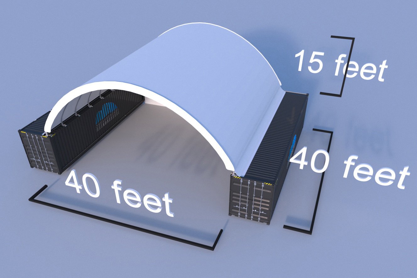 This shelter, sits across two 40ft shipping containers, connecting to the inner top edge of each container. With an easy-access 40ft(12 metre) opening at the front, and heavy-duty End Wall, this shelter adds another level of weatherproofing.